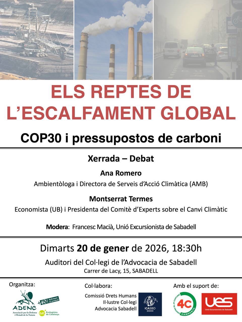 Ana Romero ens detallarà quin és el marc de referència internacional (acords de París i les conferències de les parts, la darrera la COP30, i les directives europees), i quin és el seu grau de compliment, del qual té un profund coneixement per la seva participació en les conferències i pel seguiment que en fa a través del seminari universitari en què participa.
